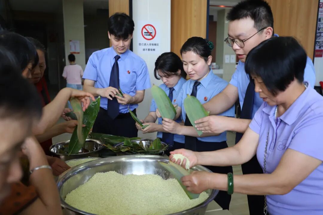 粽叶翻飞,糯米盈香。干警与东门社区居民围在一起,折粽叶、填糯米、裹扎绳,忙得不亦乐乎。有人手法娴熟,不一会儿就包出了一个个棱角分明、精致紧实的粽子;也有人初出茅庐,虽然包出的粽子“形态各异”,但那份认真劲儿和满满的成就感,让现场氛围格外温馨。一个个碧绿饱满的粽子,不仅包裹着对美好生活的期许,更凝聚着干警与群众的温暖情谊。