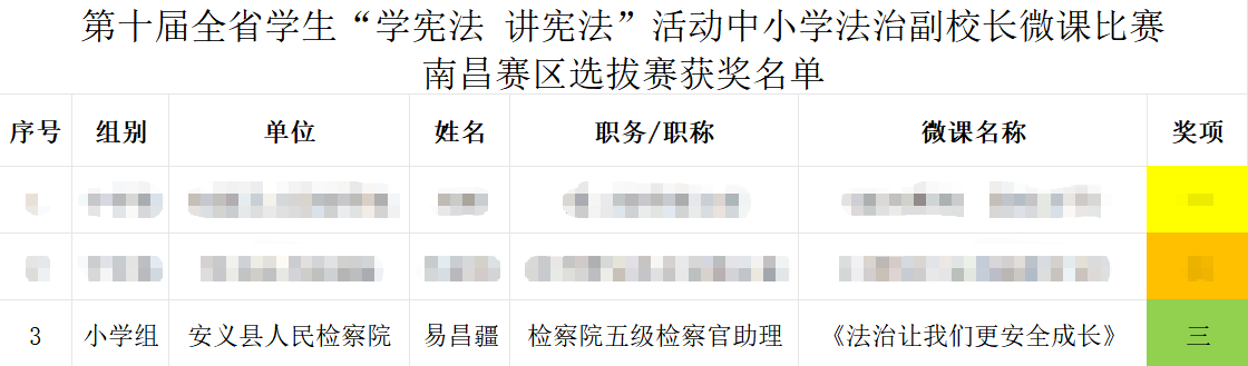 近日,第十届全省学生“学宪法 讲宪法”活动南昌赛区选拔赛获奖名单揭晓,我院干警易昌疆的微课《法治让我们更安全成长》荣获法治副校长(小学组)三等奖。